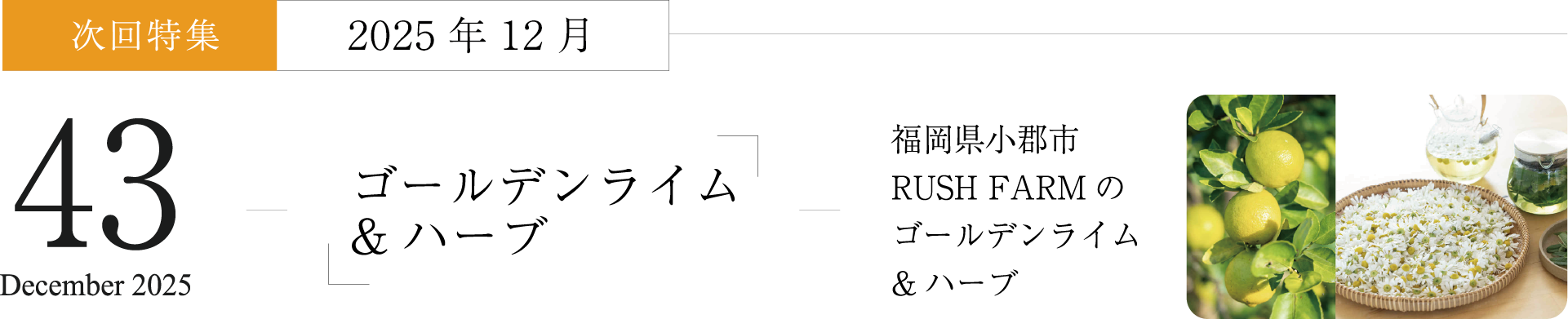 ふくおか食べる通信 福岡県小郡市 RUSH FARMの ”ゴールデンライム&ハーブティ” 2025年12月発刊43号は、福岡県小郡市、RUSH FARMの「ゴールデンライム&ハーブテ 2025年11月14日