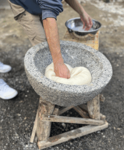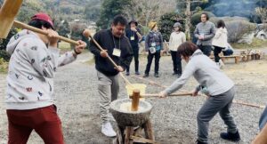 お昼過ぎに餅つきが始まり、参加者が冬なのに汗をかきながら、餅をついて、こねて、たべていました。